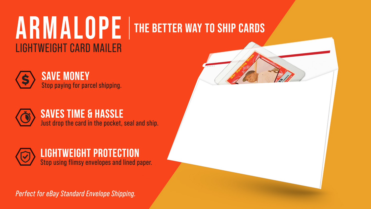 Armalope is a lightweight, durable envelope that is specifically designed for the safe shipping cards on eBay or other card trading platform. With its easy-to-use design, Armalope makes it simple to insert your cards and seal the envelope, ready for mailing. And because it is lightweight, Armalope won't add unnecessary weight to your shipment, keeping your shipping costs to a minimum.